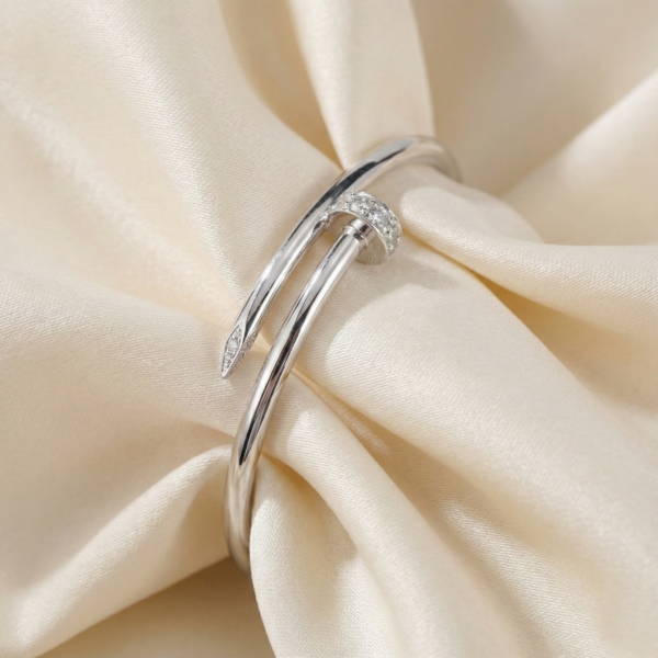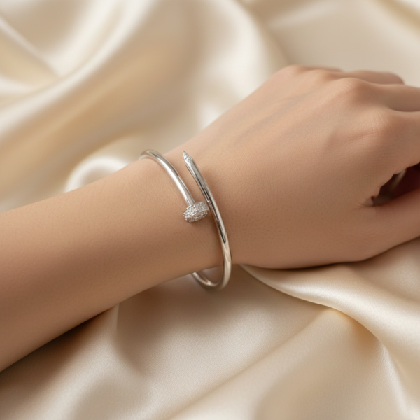 This bracelet is designed around Cartier’s famous twisted nail motif, offering a unique and bold yet utterly elegant aesthetic. The head of the nail is adorned with sparkling Cubic Zirconia stones, creating a luxurious focal point that catches the eye from every angle.