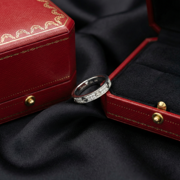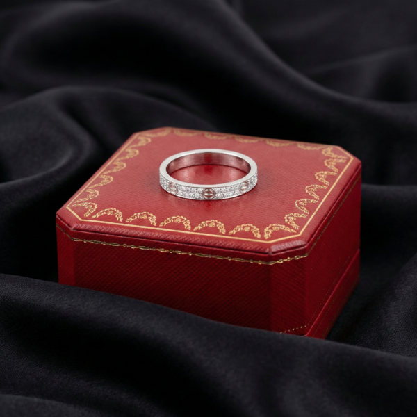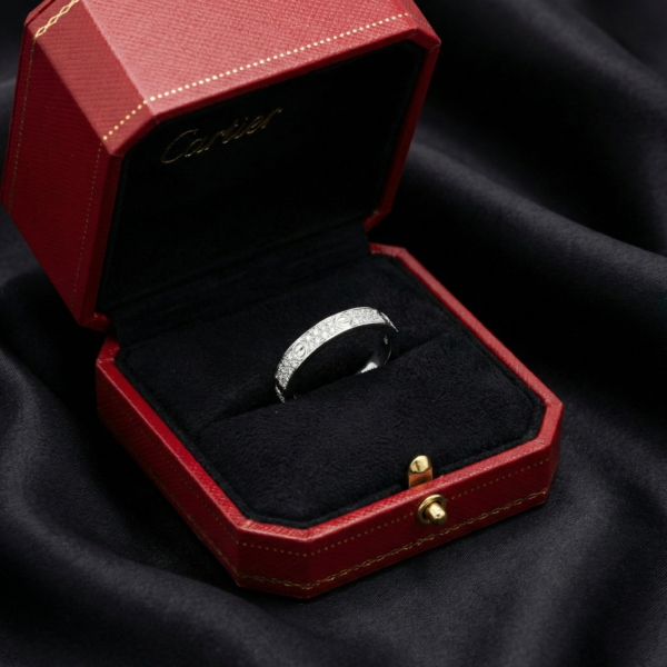 The Cartier’s LOVE ring, Small Model, Paved masterfully blends bold design with enduring elegance. This exquisite piece features a fully paved setting of sparkling cubic zirconia stones, creating a dazzling play of light. The distinctive screw motifs and ideal oval shape establish this creation as a timeless tribute to romance.
