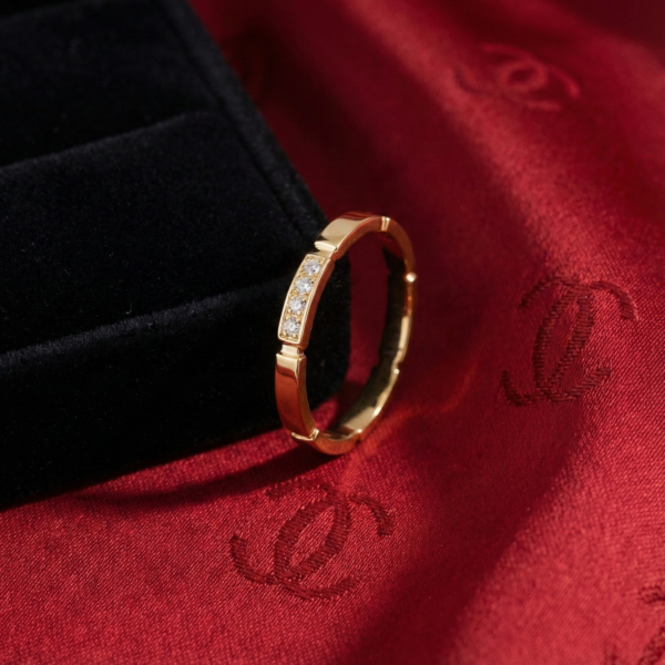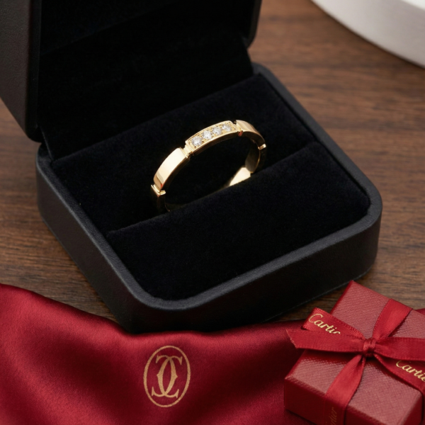 Inspired by Cartier’s iconic aesthetic, the Maillon 4-Stone Ring embodies modern elegance through its bold square-shaped band, exuding both strength and sophistication. The centerpiece features a row of brilliant cubic zirconia stones, meticulously set to create a captivating sparkle.
