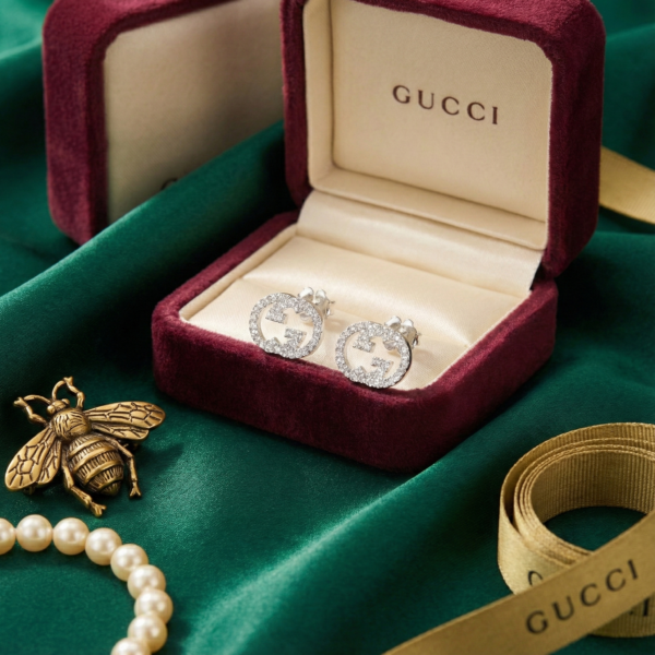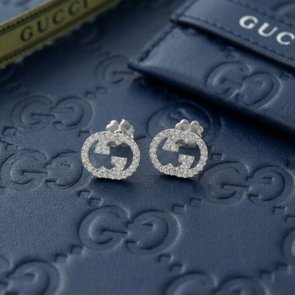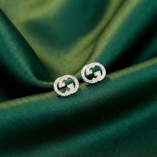 This pair of earrings belongs to the Interlocking jewelry collection, inspired by geometric logo designs. The earrings feature a stylized GG logo motif, elegantly embellished with sparkling cubic zirconia stones, creating a modern and sophisticated beauty.