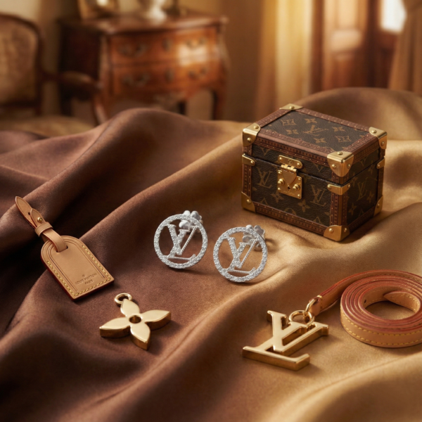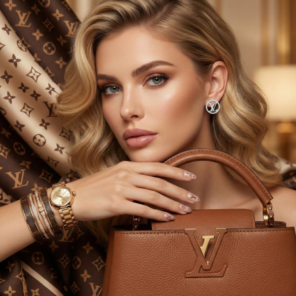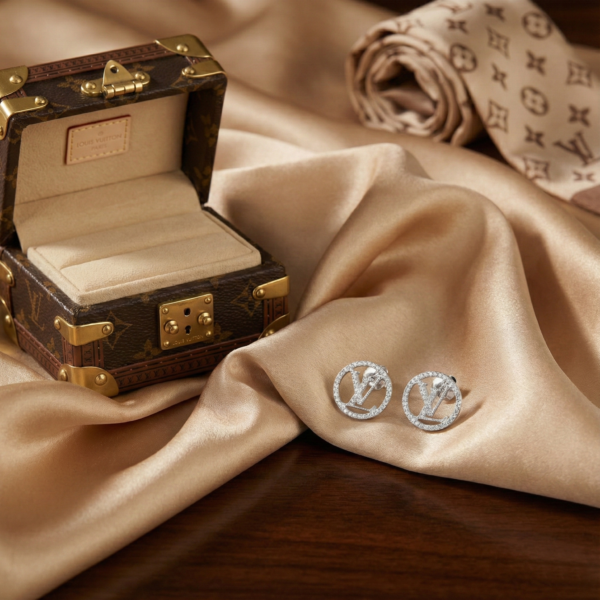 Inspired by the iconic L.V. emblem, these round stud earrings are a perfect blend of classic beauty and modern style. The prominent round design gracefully embraces the sparkling, stone-encrusted “L.V.” logo, delivering a luxurious and incredibly fashionable look.