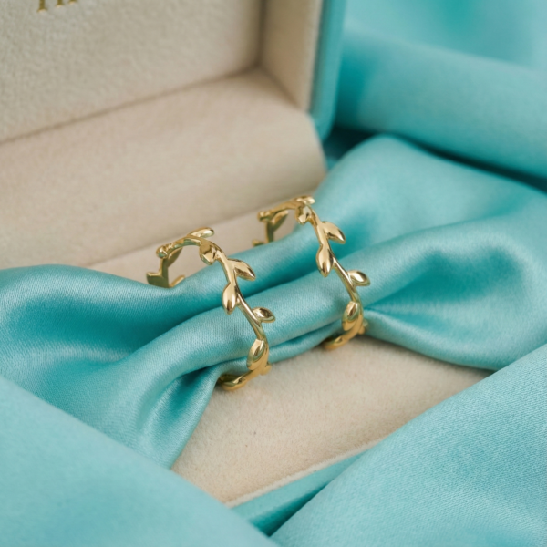 Inspired by the beauty of nature, the Tiffany Olive Leaf Hoop Earrings feature delicate, gracefully curved leaves that form a subtle, flattering arc to hug your earlobes. A stunning piece from Tiffany & Co., this design captures the organic charm of olive branches in exquisite detail.
