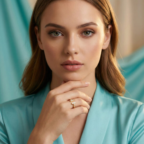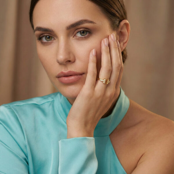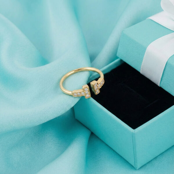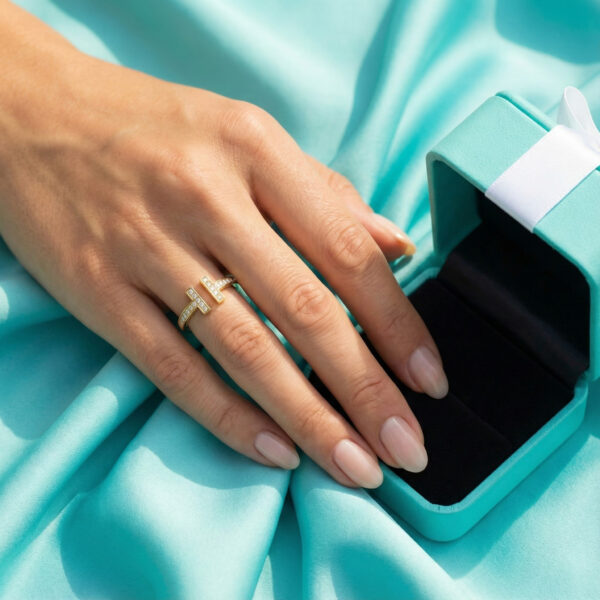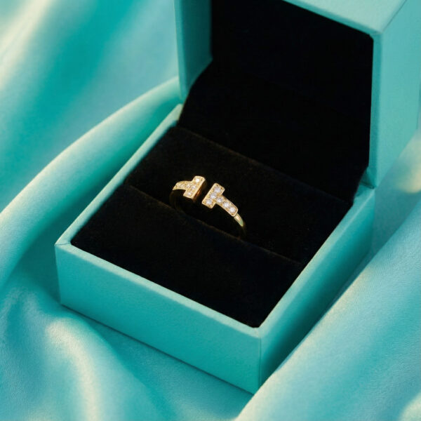 This exquisite ring showcases a distinctive “T” design, blending contemporary style with timeless sophistication. The dual “T” bars, adorned with sparkling cubic zirconia stones, create a radiant focal point on the slender band, offering a delicate yet undeniably luxurious aesthetic.