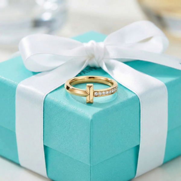 The Tiffany T Ring epitomizes contemporary elegance through its distinctive design. The piece features a sharply crafted “T” motif, accentuated by meticulously set cubic zirconia stones that lend a sophisticated sparkle to the band.