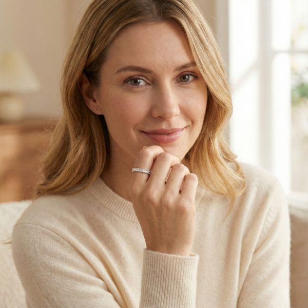 Sleek and slender (3mm width), its minimalist silhouette belies a powerful versatility. Whether worn solo for effortless everyday elegance or stacked with engagement rings for bridal brilliance, it adapts seamlessly to every moment.