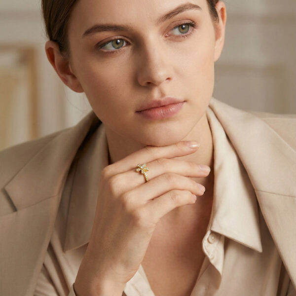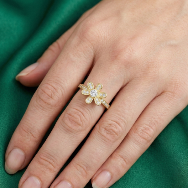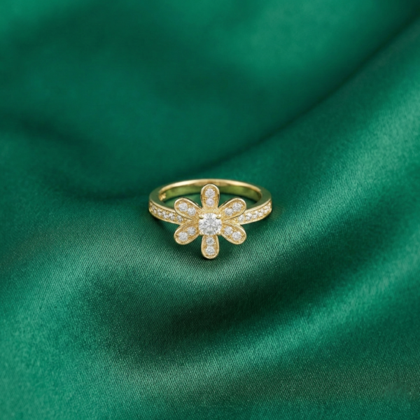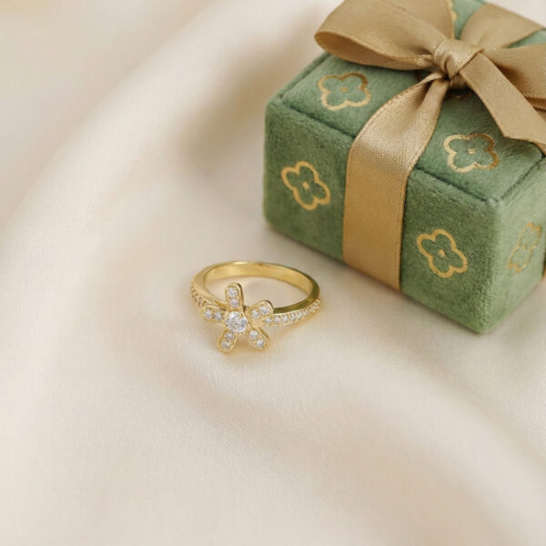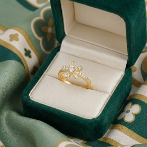 The ring’s centerpiece is a full-pavé floral motif, designed to shimmer brilliantly under light—like a flower in full bloom under the sun. Wearing this ring evokes a sense of freshness and delicate grace. Its slender band, adorned with a continuous line of accent stones, ensures a comfortable and secure fit, making it perfect for daily wear or as a statement piece for special occasions.