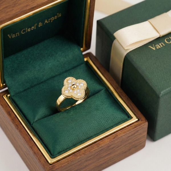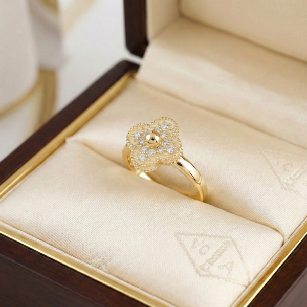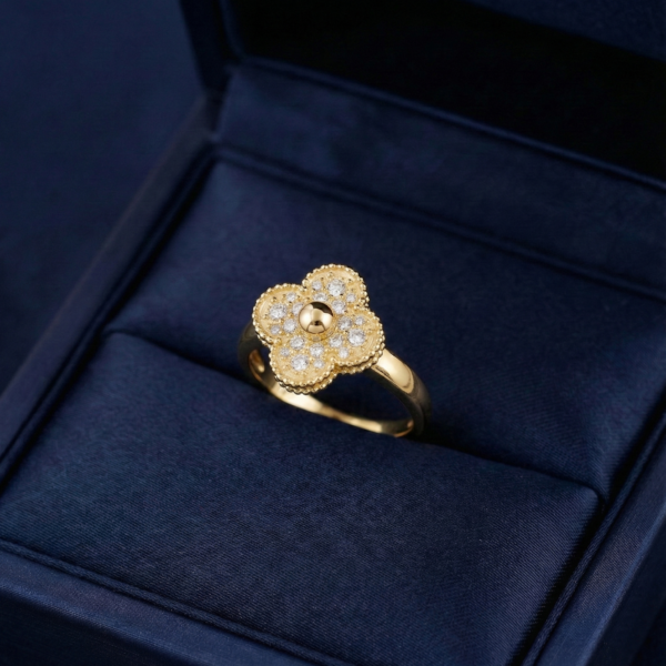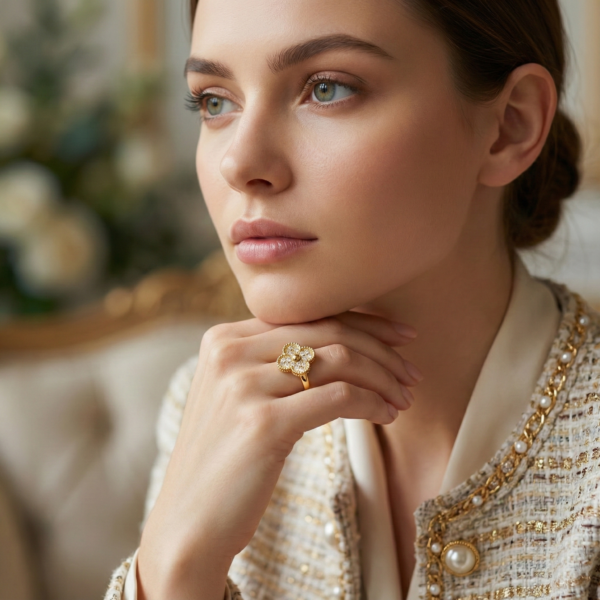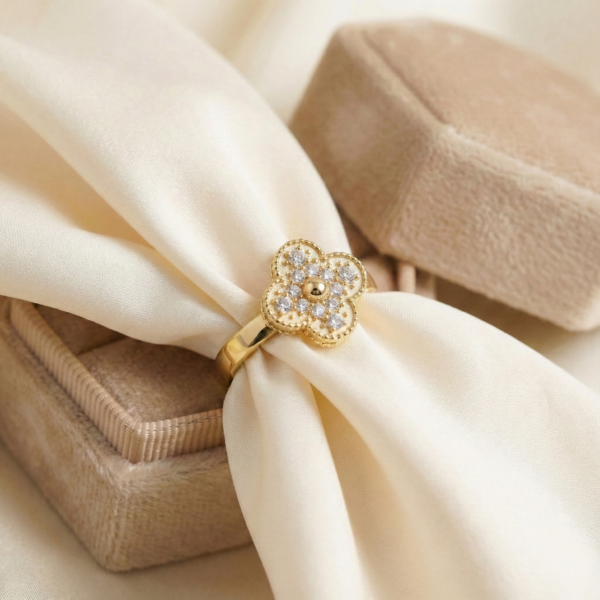 Inspired by the iconic floral designs of Van Cleef & Arpels, the Vintage Flower Ring features an exquisite four-petal motif. Each petal is delicately paved with sparkling cubic zirconia stones, creating a radiant, feminine look that’s both timeless and captivating.