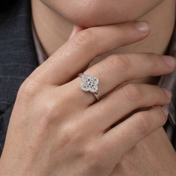 Crafted from 925 sterling silver, this ring is not only durable and long-lasting but also safe for all skin types, including sensitive skin. Each cubic zirconia stone is hand-set with precision, showcasing exceptional craftsmanship and attention to detail. The four-petal floral design symbolizes luck and eternity, making this ring more than just an accessory—it is a meaningful emblem of sophistication and grace.
